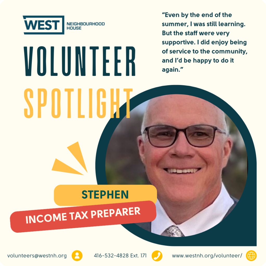 After a long and successful career in human resources, Stephen found a new way to give back – by helping low-income individuals and families file their taxes through the Income Tax Clinic at West Neighbourhood House.