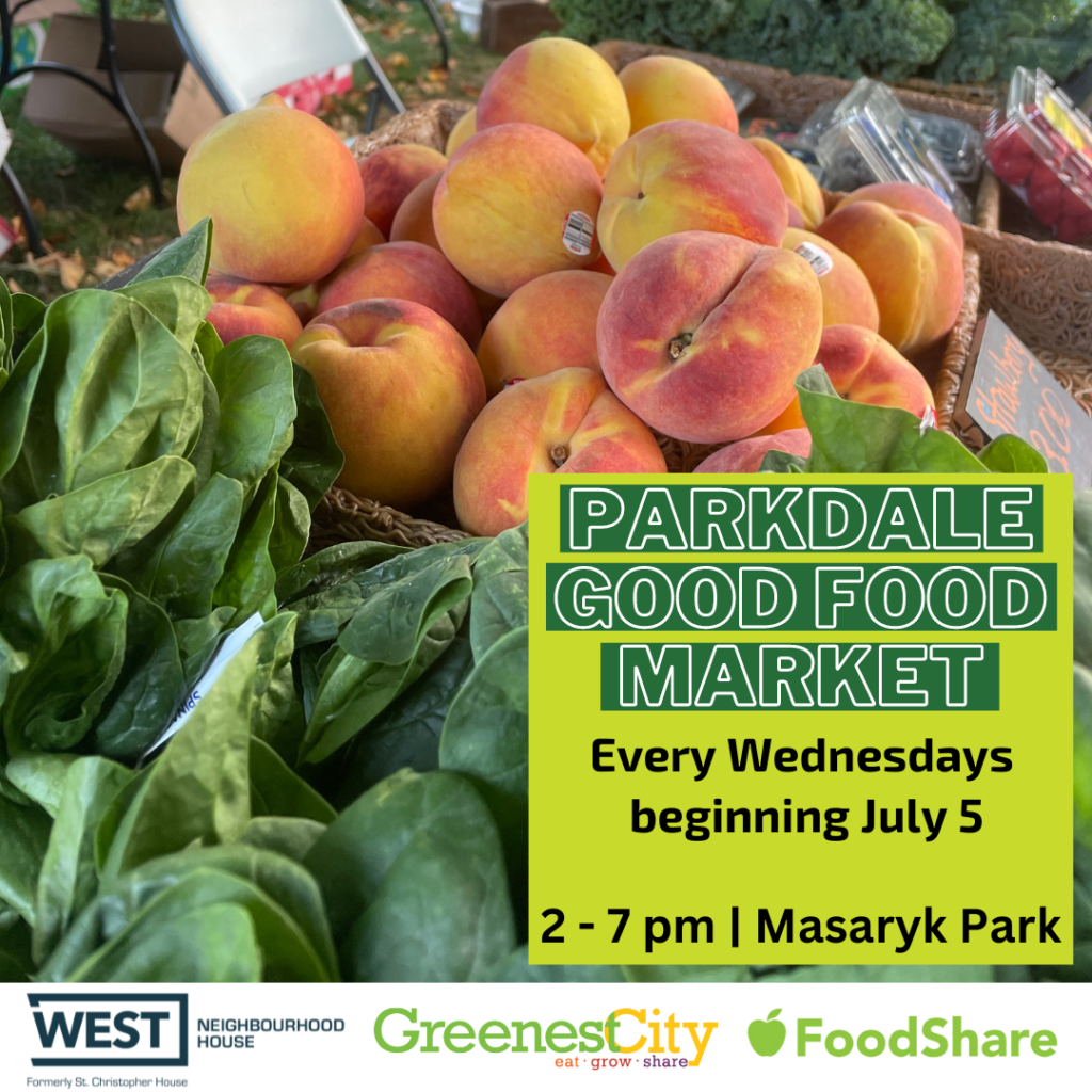 Support local and buy fresh, affordable vegetables and fruits from us! Our Parkdale Good Food Market is back every week on Wednesdays beginning July 5 at Masaryk Park (Cowan & Queen) from 4-7:30 pm!