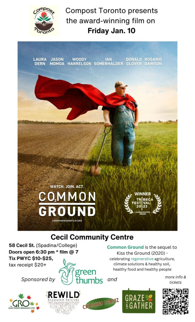 Our partner Compost Toronto is excited to present the award-winning film Common Ground. This film is the sequel to Kiss the Ground and it continues the exploration of the importance of soil to the health of the planet. “At Compost Toronto, we began as a group of students from the Soil Food Web School started by Dr. Elaine Ingham. Dr. Elaine was the first to demonstrate that soil is a dynamic ecosystem that thrives and is intimately connected to the above-ground world we see. Please join us on Friday, January 10th at 6: 30 p.m. at the Cecil Street Community Centre to view the film and meet our members.”