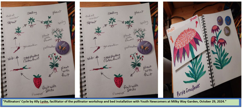 With the guidance of the South Parkdale Community Pollinator Gardens, the funding support of the Parkdale Horticultural Society, and the incredible hands-on planting, and artistic work of Canada Nos Une, Monarch Butterfly Project, and the great support of our vthis year we focused on enhancing biodiversity in our neighborhood by planting over 30 different species that attract a wide range of pollinators, including bees, hummingbirds, monarch butterflies, among others. These plants were added to the Dunn Indigenous Garden and the Milky Way Garden as part of our ongoing educational process, where we are dedicated to teaching our community about the importance of pollinators and native species, as well as the vital connections between pollinators and edible gardens.
