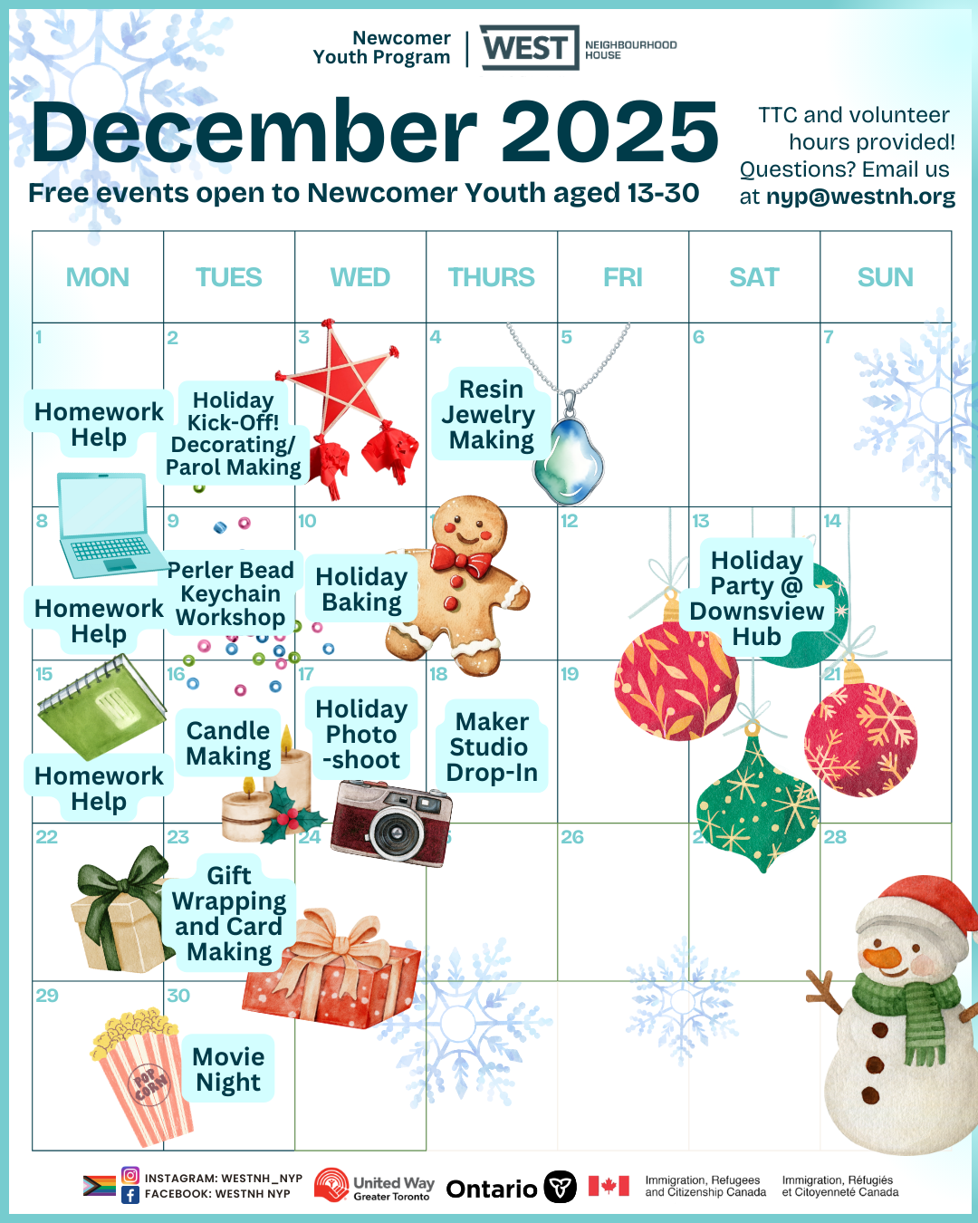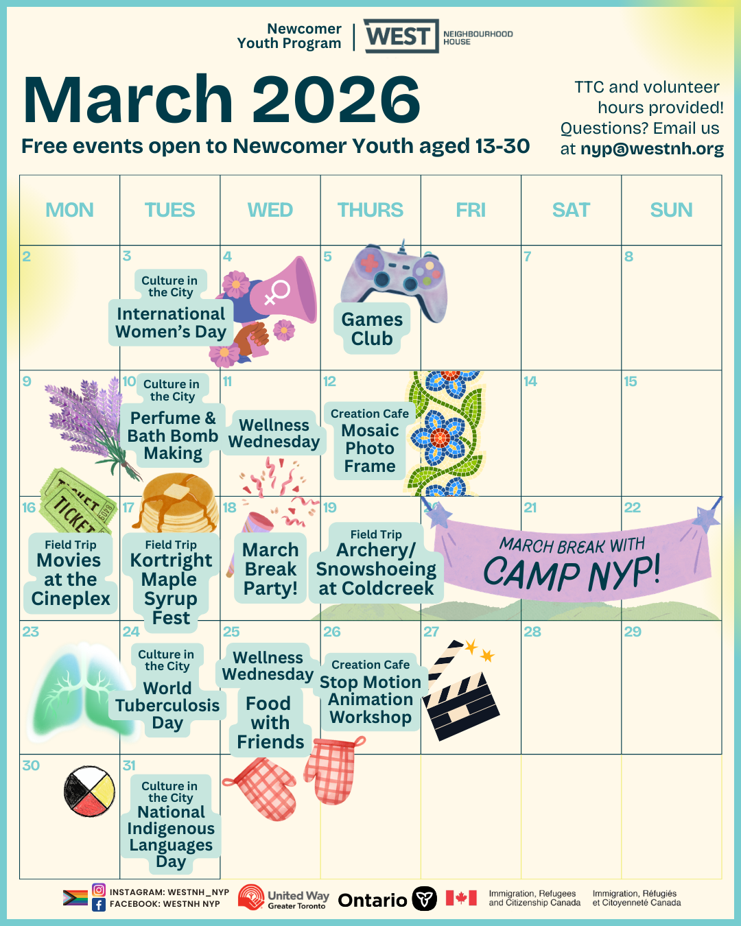 The Newcomer Youth Program is currently taking place virtually and in-person, with daily activities on social media and weekly activities on Zoom and in-person at the 248 Ossington Avenue location. Join us!